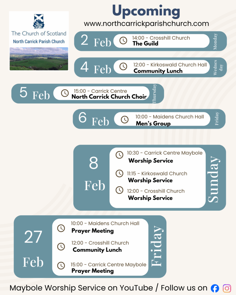 The North Carrick Parish Church of Scotland was formed with the Union of Crosshill, Kirkoswald and Maybole parishes. Each still having its own centre of Worship. North Carrick Parish Church of Scotland are located in South Ayrshire in the Southwest of Scotland.