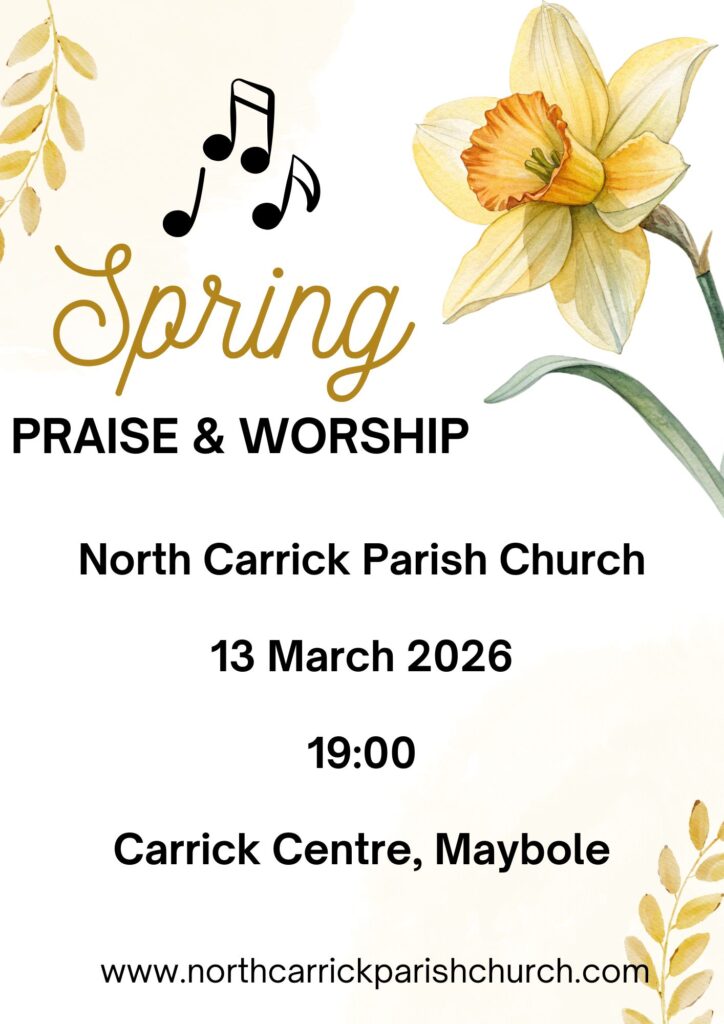 We have a Spring Praise & Worship on Friday the 13th of March at 19:00, in the Church at the Carrick Centre, Maybole.